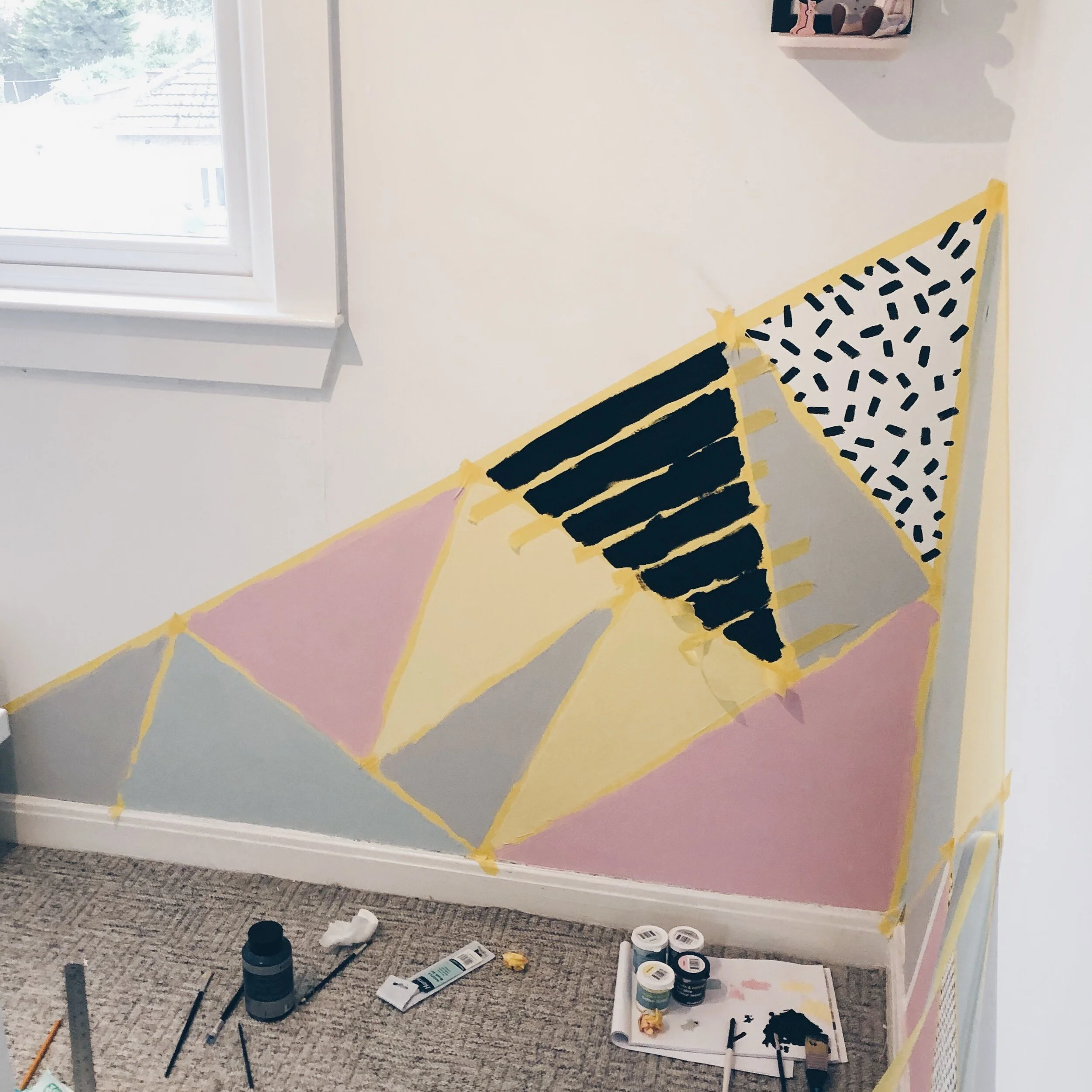 I decided to do my mural in a corner of the room to brighten it up and create a focal point for where Skyes toys and reading area would be. As her room is quite small I wanted to keep the colour choice light. A pastel pink, yellow, mint and grey with a small touch of black to give that Memphis edge.